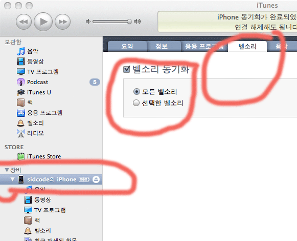 7. iPhone을 연결한후 iPhone 보관함에서 벨소리 체크후 동기화하면 iPhone에서 변환한 벨소리 사용가능